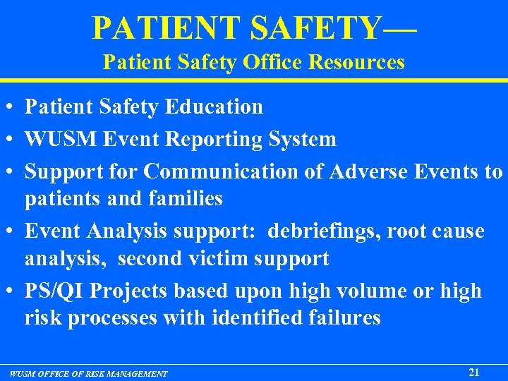 PATIENT SAFETY— WUSM PS Physician Council • • • Anesthesiology Emergency Dept. Internal Medicine Neurosurgery OB/GYN Ophthalmology Orthopedics Otolaryngology Pediatrics Radiation Oncology Radiology Surgery WUSM OFFICE OF RISK MANAGEMENT Andrea Vannucci Chris Carpenter, Richard Griffey, Rob Poirier Emily Fondahn, Mike Lane, Myra Rubio Paul Santiago vacant David Vollman Kathryn Keeler Brian Nussenbaum Nikoleta Kolovos, Pele Yu, George Van Hare Imran Zoberi James Duncan, Andrew Bierhals Doug Schuerer 20