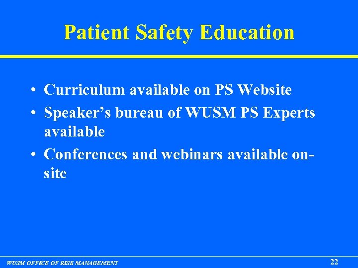 PATIENT SAFETY— Patient Safety Office Resources • Patient Safety Education • WUSM Event Reporting System • Support for Communication of Adverse Events to patients and families • Event Analysis support: debriefings, root cause analysis, second victim support • PS/QI Projects based upon high volume or high risk processes with identified failures WUSM OFFICE OF RISK MANAGEMENT 21