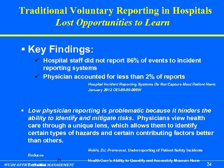 Traditional Voluntary Reporting in Hospitals Lost Opportunities to Learn § Key Findings: ü Hospital staff did not report 86% of events to incident reporting systems ü Physician accounted for less than 2% of reports Hospital Incident Reporting Systems Do Not Capture Most Patient Harm. January 2012 OEI-06 -09 -00091 § Low physician reporting is problematic because it hinders the ability to identify and mitigate risks. Physicians view health care through a unique lens, which allows them to identify certain types of hazards and certain contributing factors better than others. Noble, DJ, Pronovost, Underreporting of Patient Safety Incidents Reduces 24 WUSM OFFICE OF RISK MANAGEMENT Reduction. Health Care’s Ability to Quantify and Accurately Measure Harm 24