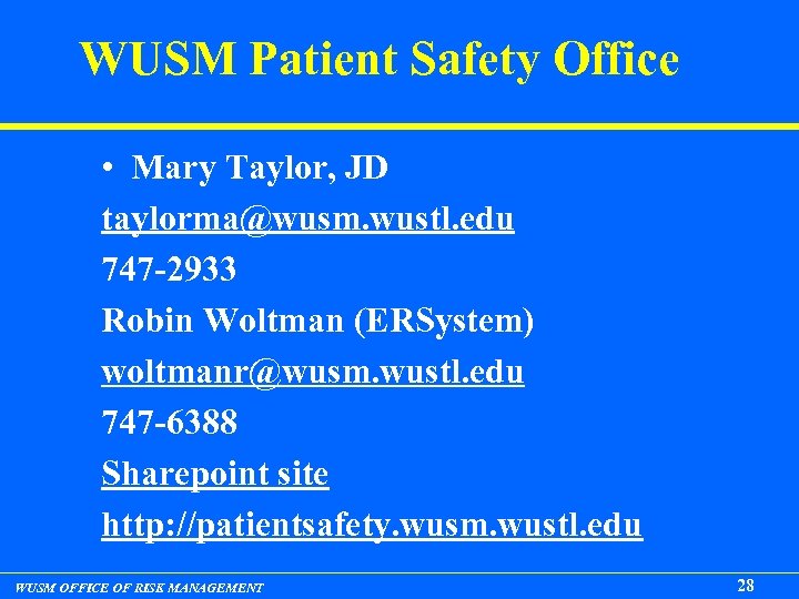 WUSM Patient Safety Office • Mary Taylor, JD taylorma@wusm. wustl. edu 747 -2933 Robin Woltman (ERSystem) woltmanr@wusm. wustl. edu 747 -6388 Sharepoint site http: //patientsafety. wusm. wustl. edu WUSM OFFICE OF RISK MANAGEMENT 28