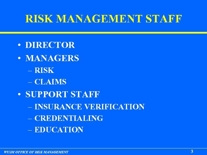 RISK MANAGEMENT STAFF • DIRECTOR • MANAGERS – RISK – CLAIMS • SUPPORT STAFF – INSURANCE VERIFICATION – CREDENTIALING – EDUCATION WUSM OFFICE OF RISK MANAGEMENT 3
