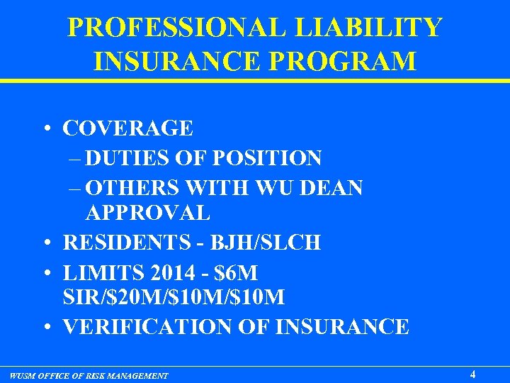 PROFESSIONAL LIABILITY INSURANCE PROGRAM • COVERAGE – DUTIES OF POSITION – OTHERS WITH WU DEAN APPROVAL • RESIDENTS - BJH/SLCH • LIMITS 2014 - $6 M SIR/$20 M/$10 M • VERIFICATION OF INSURANCE WUSM OFFICE OF RISK MANAGEMENT 4