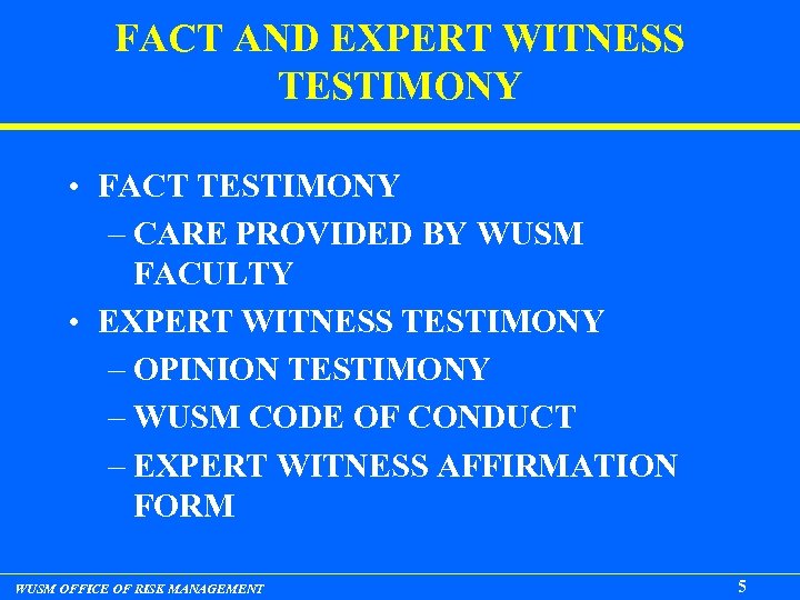 FACT AND EXPERT WITNESS TESTIMONY • FACT TESTIMONY – CARE PROVIDED BY WUSM FACULTY • EXPERT WITNESS TESTIMONY – OPINION TESTIMONY – WUSM CODE OF CONDUCT – EXPERT WITNESS AFFIRMATION FORM WUSM OFFICE OF RISK MANAGEMENT 5