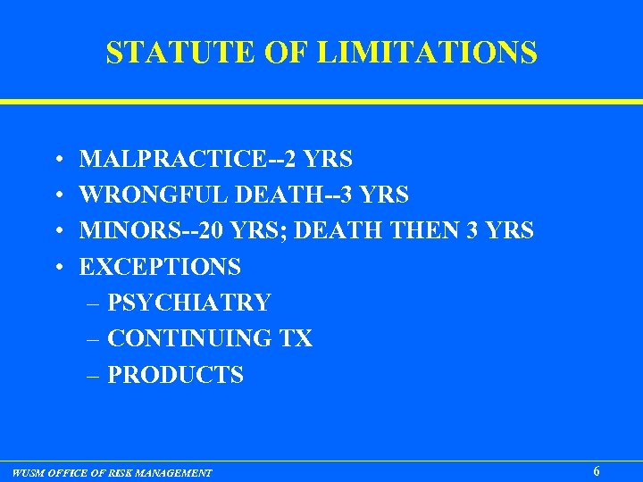 STATUTE OF LIMITATIONS • • MALPRACTICE--2 YRS WRONGFUL DEATH--3 YRS MINORS--20 YRS; DEATH THEN 3 YRS EXCEPTIONS – PSYCHIATRY – CONTINUING TX – PRODUCTS WUSM OFFICE OF RISK MANAGEMENT 6