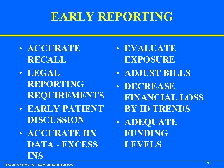 EARLY REPORTING • ACCURATE RECALL • LEGAL REPORTING REQUIREMENTS • EARLY PATIENT DISCUSSION • ACCURATE HX DATA - EXCESS INS WUSM OFFICE OF RISK MANAGEMENT • EVALUATE EXPOSURE • ADJUST BILLS • DECREASE FINANCIAL LOSS BY ID TRENDS • ADEQUATE FUNDING LEVELS 7