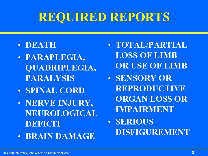 REQUIRED REPORTS • DEATH • PARAPLEGIA, QUADRIPLEGIA, PARALYSIS • SPINAL CORD • NERVE INJURY, NEUROLOGICAL DEFICIT • BRAIN DAMAGE WUSM OFFICE OF RISK MANAGEMENT • TOTAL/PARTIAL LOSS OF LIMB OR USE OF LIMB • SENSORY OR REPRODUCTIVE ORGAN LOSS OR IMPAIRMENT • SERIOUS DISFIGUREMENT 8