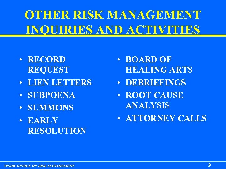 OTHER RISK MANAGEMENT INQUIRIES AND ACTIVITIES • RECORD REQUEST • LIEN LETTERS • SUBPOENA • SUMMONS • EARLY RESOLUTION WUSM OFFICE OF RISK MANAGEMENT • BOARD OF HEALING ARTS • DEBRIEFINGS • ROOT CAUSE ANALYSIS • ATTORNEY CALLS 9