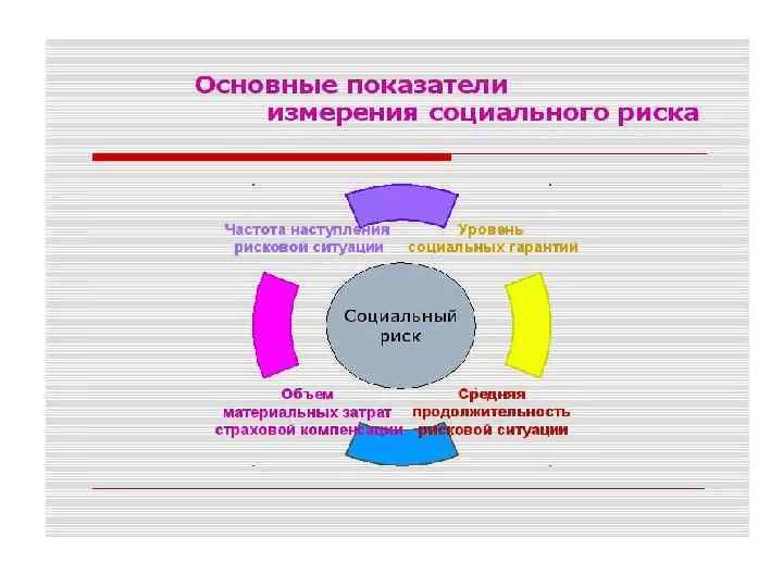 Источники и факторы социального риска Источник социального риска Наиболее распространенные факторы социального риска Урбанизация (освоение) экологически неустойчивых территорий Поселение людей в зонах возможного затопления, образование оползней, пожаров, извержения вулканов, повышенной сейсмичности региона Промышленные технологии и объекты повышенной опасности Аварии на АЭС, ТЭС, химических комбинатах, продуктопроводах и т. п. Техногенное загрязнение ОС Источник социального риска Наиболее распространенные факторы социального риска Социальные и военные конфликты Боевые действия. Применение оружия массового поражения Эпидемии Распространение вирусных инфекций Снижение качества жизни Голод, нищета. Ухудшение медицинского обслуживания. Неудовлетворительные жилищнобытовые условия.