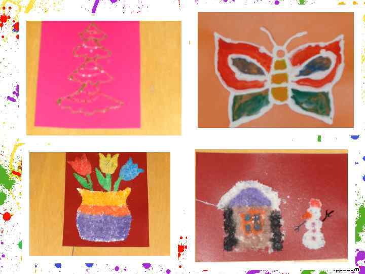 Задачи: • Дать представление детям о различных видах изобразительной деятельн ости, многообразии художественных материалов (рисование с помощью соли), • развивать художественный вкус, фантазию, желание экспериментировать в своей работе, • развивать мелкую моторику, • воспитывать аккуратность, трудолюбие, целеустремленность.