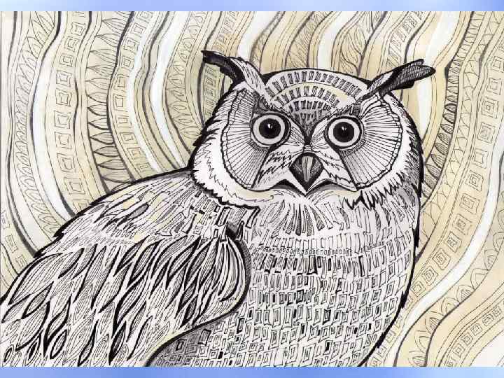 Этапы работы • 5, 6 этап: Приступаем к работе над крыльями. Орнамент крыльев должен быть одинаков (симметричен) – точки, треугольники, волнистые линии. Прорабатываем хвост. Усиливаем линии по ритму: тонкая линия, толстая линия. На груди птицы прорисовываем ожерелье из перьев и точек разной величины. В конце работы можно добавить звёзды, месяц, снежинки. Фантазия не имеет границ.