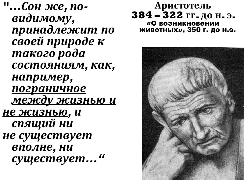 "...Сон же, по-видимому, принадлежит по своей природе к такого рода состояниям, как, например, пограничное между жизнью и не жизнью, и спящий ни не существует вполне, ни существует...“ Аристотель 384 – 322 гг. до н. э. «О возникновении животных», 350 г. до н.э.