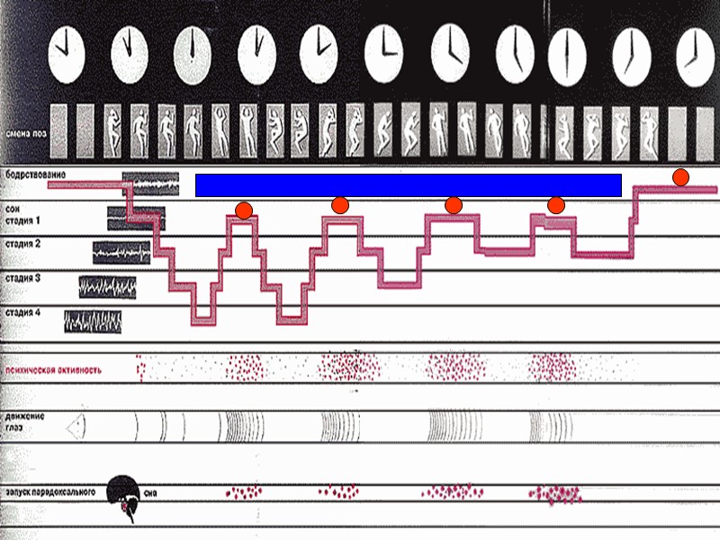Стадия A — исходная для засыпания, преобладает альфа-ритм (8–12 колебаний/с), характерный для состояния спокойного бодрствования, который прерывается десинхронизацией, отражающей напряжение внимания. Стадия B — сонливость, преобладают низковольтные колебания разной частоты. Стадия C — поверхностный сон, в электрической активности мозга появляются веретенообразные группы колебаний 12–14 колебаний/с и отдельные медленные волны. Стадия D — углубление сна, появляются гигантские (200–300 мкВ) медленные волны дельта-ритма (1–3 колебаний/с). Стадия E — глубокий сон, непрерывные ряды медленных волн дельта-ритма. Стадия P (парадоксальная) — глубокий сон, сопровождаемый вздрагиваниями, движениями глазных яблок, сновидениями; в электроэнцефалограмме — десинхронизация, напоминающая реакции внимания при бодрствовании, но более высокой частоты (до 40 колебаний/с). Стадии D и E обозначают как период МС, а стадию Р — как период ПС. В течение ночи глубина сна может многократно меняться. Соответственно стадии сна будут сменять друг друга при выходе из глубокого сна в обратном порядке, а при следующем его углублении — в обычной последовательности. Поэтому стадии МС и ПС много раз чередуются. При нормальном 8-часовом ночном сне МС занимает в общей сложности 6,5 ч, а ПС — более 1,5 ч. Распределение МС и ПС сна меняется в зависимости от его длительности, времени засыпания, предшествующей деятельности, степени утомления и других обстоятельств.