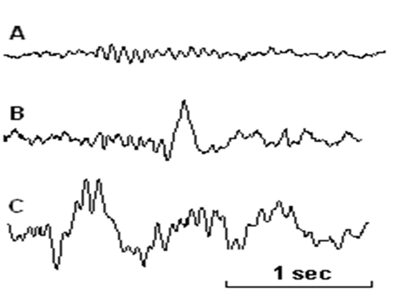 Альфа-ритм —колебания потенциала с частотой, лежащей в пределах от 8 до 13 Гц. Бета-ритм —колебания потенциала с частотой, лежащей в пределах от 13 до 35 Гц. Тета-ритм —колебания потенциала с частотой, лежащей в пределах от 4 до 8 Гц. Дельта-ритм — колебания потенциала, лежащие в пределах от 0,3 до 4 Гц. Веретена сна — веретенообразные вспышки биоэлектрической активности, появляющиеся во время сна с частотой около 14–16 Гц. Вертекс-потенциал — комплекс из высокоамплитудных волн различных периодов, максимально выраженный в макушечной области (вертекс); К-комплекс – вертекс потенциал с последующим сонным веретеном появление нескольких медленных волн с увеличивающимся периодом, переходящим во вспышку низкочастотного бета-ритма .