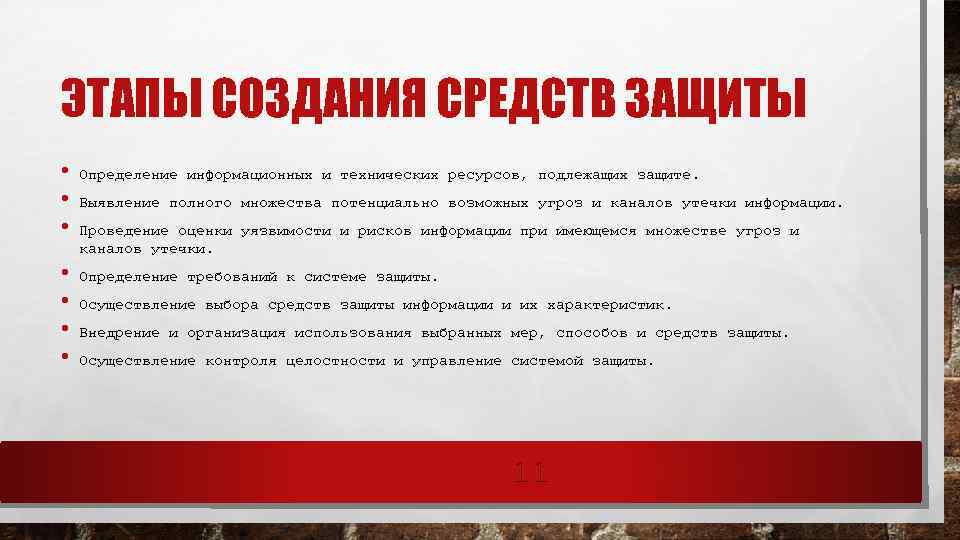 НАПРАВЛЕНИЯ ЗАЩИТЫ • Защита объектов информационной системы. • Защита процессов, процедур и программ обработки информации. • Защита каналов связи (акустические, инфракрасные, проводные, радиоканалы и др. ). • Подавление побочных электромагнитных излучений. • Управление системой защиты. 10