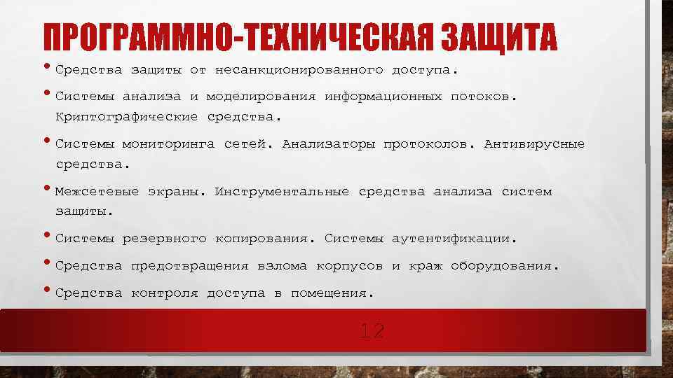ЭТАПЫ СОЗДАНИЯ СРЕДСТВ ЗАЩИТЫ • • Определение информационных и технических ресурсов, подлежащих защите. Выявление полного множества потенциально возможных угроз и каналов утечки информации. Проведение оценки уязвимости и рисков информации при имеющемся множестве угроз и каналов утечки. Определение требований к системе защиты. Осуществление выбора средств защиты информации и их характеристик. Внедрение и организация использования выбранных мер, способов и средств защиты. Осуществление контроля целостности и управление системой защиты. 11