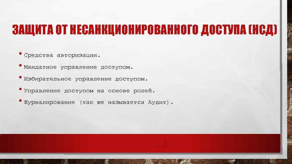 ПРОГРАММНО-ТЕХНИЧЕСКАЯ ЗАЩИТА • Средства защиты от несанкционированного доступа. • Системы анализа и моделирования информационных потоков. Криптографические средства. • Системы мониторинга сетей. Анализаторы протоколов. Антивирусные средства. • Межсетевые экраны. Инструментальные средства анализа систем защиты. • Системы резервного копирования. Системы аутентификации. • Средства предотвращения взлома корпусов и краж оборудования. • Средства контроля доступа в помещения. 12