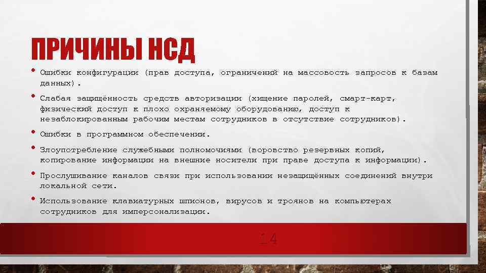ЗАЩИТА ОТ НЕСАНКЦИОНИРОВАННОГО ДОСТУПА (НСД) • Средства авторизации. • Мандатное управление доступом. • Избирательное управление доступом. • Управление доступом на основе ролей. • Журналирование (так же называется Аудит). 13