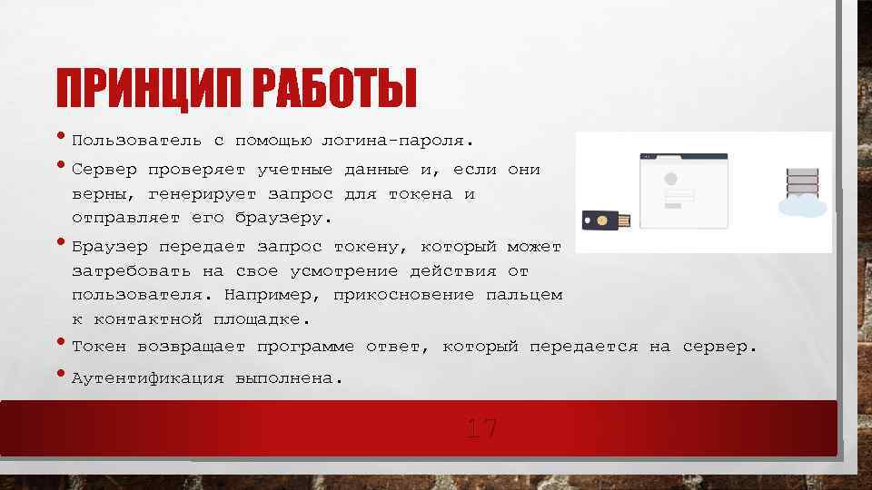 ПРИНЦИП РАБОТЫ • Пользователь с помощью логина-пароля. • Сервер проверяет учетные данные и, если они верны, генерирует запрос для токена и отправляет его браузеру. • Браузер передает запрос токену, который может затребовать на свое усмотрение действия от пользователя. Например, прикосновение пальцем к контактной площадке. • Токен возвращает программе ответ, который передается на сервер. • Аутентификация выполнена. 17