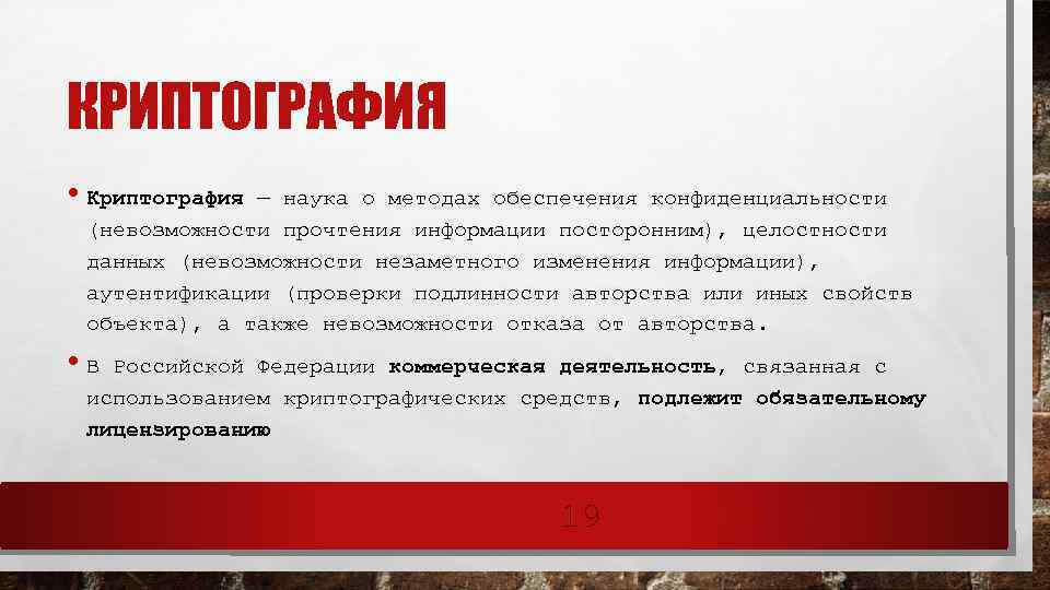 КРИПТОГРАФИЯ • Криптография — наука о методах обеспечения конфиденциальности (невозможности прочтения информации посторонним), целостности данных (невозможности незаметного изменения информации), аутентификации (проверки подлинности авторства или иных свойств объекта), а также невозможности отказа от авторства. • В Российской Федерации коммерческая деятельность, связанная с использованием криптографических средств, подлежит обязательному лицензированию 19