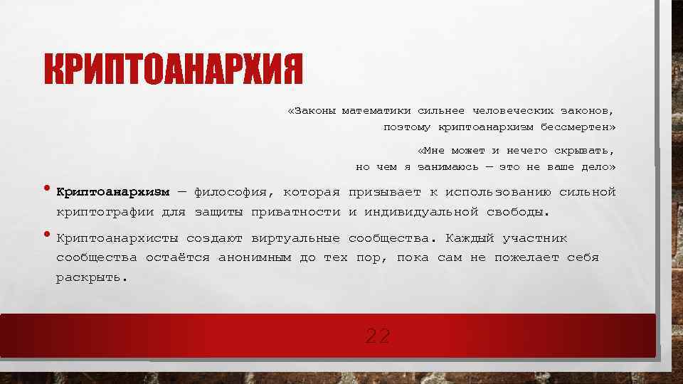 КРИПТОАНАРХИЯ «Законы математики сильнее человеческих законов, поэтому криптоанархизм бессмертен» «Мне может и нечего скрывать, но чем я занимаюсь — это не ваше дело» • Криптоанархизм — философия, которая призывает к использованию сильной криптографии для защиты приватности и индивидуальной свободы. • Криптоанархисты создают виртуальные сообщества. Каждый участник сообщества остаётся анонимным до тех пор, пока сам не пожелает себя раскрыть. 22