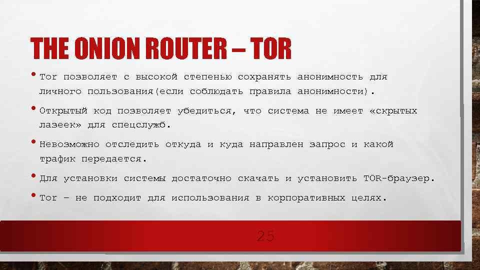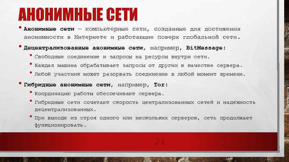 АНОНИМНЫЕ СЕТИ • Анонимные сети — компьютерные сети, созданные для достижения анонимности в Интернете и работающие поверх глобальной сети. • Децентрализованные анонимные сети, например, Bit. Message: • Свободные соединение и запросы на ресурсы внутри сети. • Каждая машина обрабатывает запросы от других в качестве сервера. • Любой участник может разорвать соединение в любой момент времени. • Гибридные анонимные сети, например, Tor: • Координацию работы обеспечивают сервера. • Гибридные сети сочетают скорость централизованных сетей и надёжность децентрализованных. • При выходе из строя одного или нескольких серверов, сеть продолжает функционировать. 24