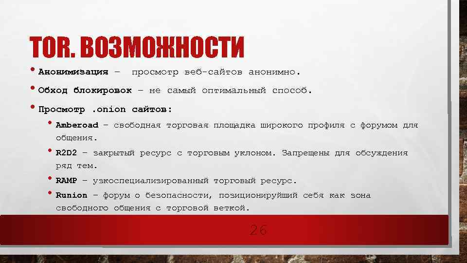 TOR. ВОЗМОЖНОСТИ • Анонимизация – просмотр веб-сайтов анонимно. • Обход блокировок – не самый оптимальный способ. • Просмотр. onion сайтов: • Amberoad – свободная торговая площадка широкого профиля с форумом для общения. • R 2 D 2 – закрытый ресурс с торговым уклоном. Запрещены для обсуждения ряд тем. • RAMP – узкоспециализированный торговый ресурс. • Runion – форум о безопасности, позиционируйший себя как зона свободного общения с торговой веткой. 26