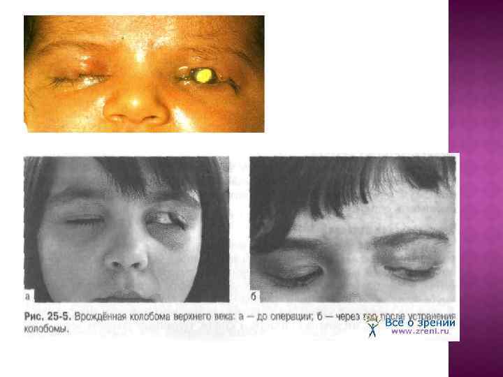 Микроблефарон, аблефария, колобома век. Микроблефарон — уменьшение вертикального размера век. Аблефария — полное отсутствие век. Патология бывает односторонней и двусторонней. Колобома век — сквозной дефект века от края до орбито-пальпебральной борозды, значительно реже до брови. Чаще регистрируют колобому верхнего века в медиальной трети или в центре, но бывают и латеральные колобомы, а также колобомы обоих век или двусторонние.