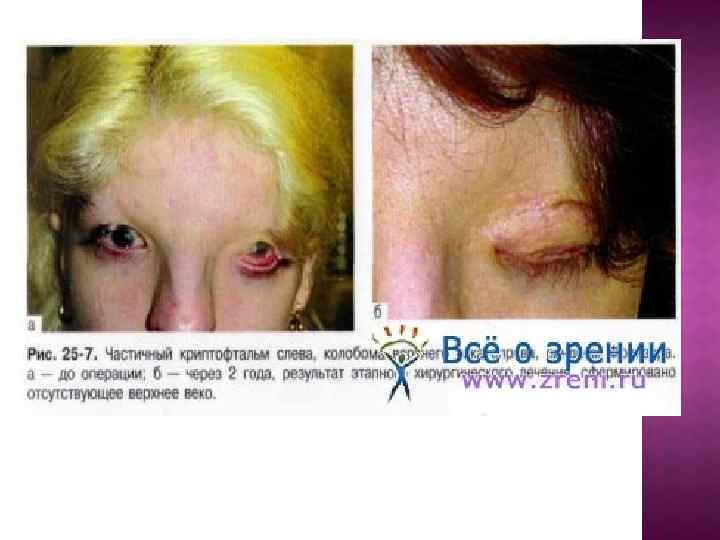 КЛИНИЧЕСКАЯ КАРТИНА Анкилоблефарон — веки сращены между собой полностью или есть отдельные спайки, глаз под веками подвижен, спокоен. Криптофтальм полный — веки отсутствуют полностью, при этом кожа лба сразу переходит в кожу щеки, отсутствуют тарзальные пластины, железы, ресницы, отсутствует конъюнктивальная полость. Частичный отсутствует одно веко, кожа лба переходит на бульбарную конъюнктиву и роговицу; лагофтальм, помутнение и дистрофия роговицы, в запущенных случаях — язва роговицы.