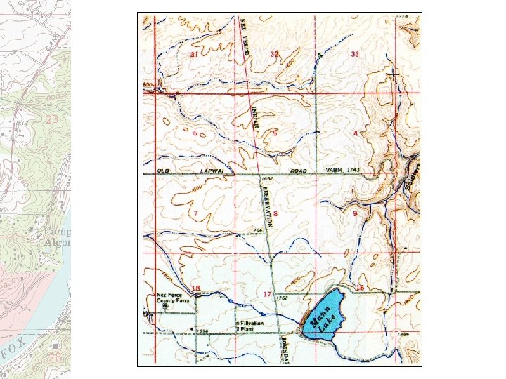 Topographic Maps • Show elevation and landforms • Natural and human features • Larger scale than highway map; smaller area with more detail • Also called ‘topo’ maps, or quadrangle maps