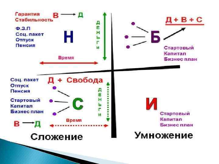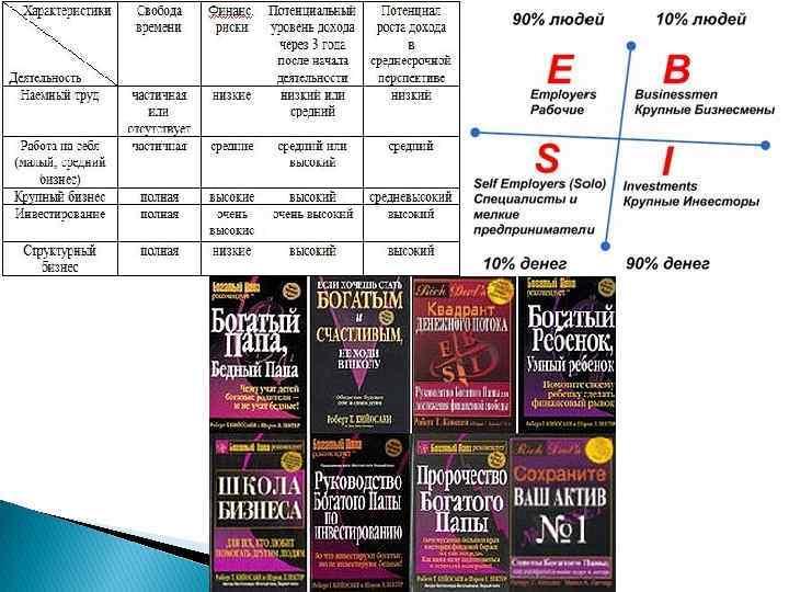 Квадрант денежного потока В каком секторе находитесь Вы? Этот ли сектор подходит Вам лучше всего? Вы финансово свободны? «Денежный поток» написан для Вас, если Ваша жизнь стоит у развилки финансовых путей. Если хотите взять под контроль то, чем Вы занимаетесь сегодня, чтобы изменить свою финансовую судьбу, то эта книга поможет Вам начертить свои последующие шаги. Вот как выглядит квадрант. Буквы в каждом секторе обозначают: Е – служащий S – работающий на себя В – владелец бизнеса I – инвестор Каждый из нас находится как минимум в одном из четырех приведенных выше секторов денежного потока. Наше место определяется источником получения наличных денежных средств. Многие из нас полагаются на чеки, которыми оплачивается их оклад, поэтому являются служащими, в то время как другие работают только на себя. Служащие и работающие на себя находятся на левой стороне денежного квадранта. В правой стороне квадранта находятся люди, которые получают наличные деньги с собственного бизнеса или благодаря инвестициям. «Квадрант денежного потока» изображает разные типы людей, которые составляют мир бизнеса, он объясняет, кто эти люди и какие их отличительные черты. Это поможет вам определить, в каком именно секторе Вы находитесь, и начертить Ваши дальнейшие шаги для достижения в будущем финансовой свободы. Так как финансовую свободу можно найти в любом из четырех секторов, то навыки и мастерство людей типа «В» и «I» помогут Вам достичь финансовых целей как можно быстрее. Успешные люди типа «Е» должны также стать успешными в секторе «I» .