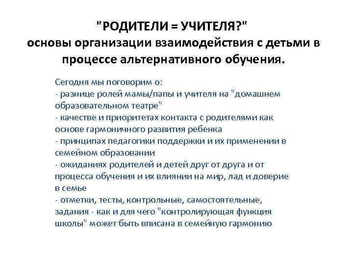 "РОДИТЕЛИ = УЧИТЕЛЯ? " основы организации взаимодействия с детьми в процессе альтернативного обучения. Сегодня мы поговорим о: - разнице ролей мамы/папы и учителя на "домашнем образовательном театре" - качестве и приоритетах контакта с родителями как основе гармоничного развития ребенка - принципах педагогики поддержки и их применении в семейном образовании - ожиданиях родителей и детей друг от друга и от процесса обучения и их влиянии на мир, лад и доверие в семье - отметки, тесты, контрольные, самостоятельные, задания - как и для чего "контролирующая функция школы" может быть вписана в семейную гармонию