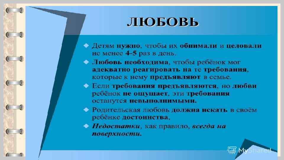 • Если дети живут в обстановке критики, они учатся осуждать. Если дети живут в обстановке вражды, они учатся конфликтовать. Если дети живут в постоянном страхе, они начинают всего бояться. Если дети живут в обстановке жалости, они начинают жалеть самих себя. Если детей все время высмеивают, они становятся застенчивыми. Если дети видят перед глазами ревность, они вырастают завистниками. Если детей все время стыдят, они привыкают к чувству вины. •