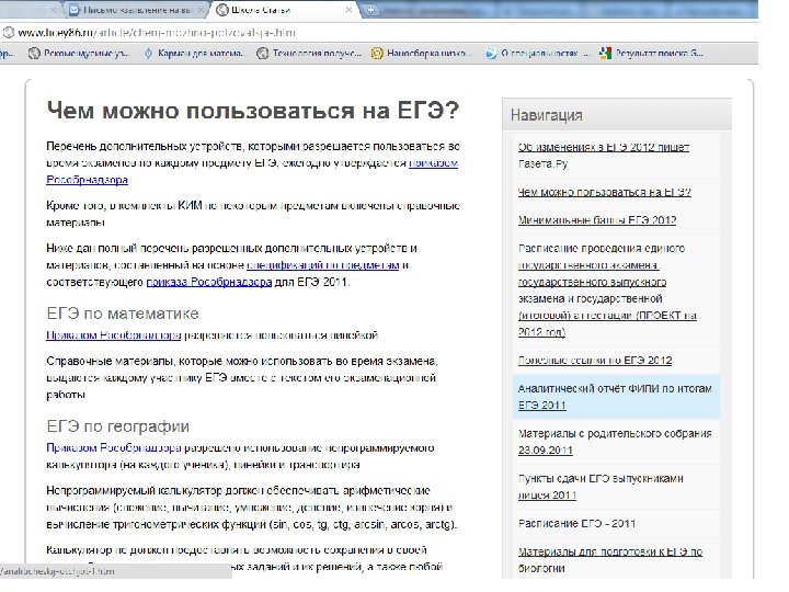 На ЕГЭ разрешается пользоваться следующими дополнительными устройствами и материалами: • математика – линейка; • физика – линейка и непрограммируемый калькулятор, обеспечивающий выполнение всех арифметических действий, вычисление квадратного корня и тригонометрических функций (sin, cos, tg), • химия – непрограммируемый калькулятор, периодическая система химических элементов Д. И. Менделеева, таблица растворимости солей, кислот и оснований в воде, электрохимический ряд напряжений металлов; • география – линейка, транспортир, непрограммируемый калькулятор.