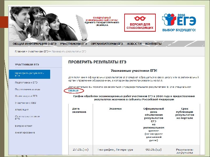 ИНТЕРНЕТ-РЕСУРСЫ по вопросам ЕГЭ Официальный информационный портал ЕГЭ www. ege. edu. ru -основные сведения о ЕГЭ - нормативные правовые документы; - правила и процедура проведения ЕГЭ; - ЕГЭ для участников с ограниченными возможностями здоровья; - демонстрационные варианты ЕГЭ; - новости ЕГЭ - Результаты ЕГЭ. Сайт федерального института педагогических измерений www. fipi. ru - контрольно-измерительные материалы ЕГЭ за 2004 -2016 годы по всем предметам;