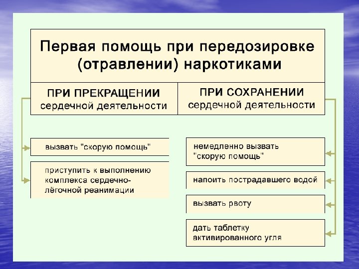 Первая помощь при отравлении алкоголем • Уложить набок и очистит дыхательные пути • Дать понюхать ватку, смоченную в нашатырном спирте • Промыть желудок • Положить на голову холодный компресс • Вызвать скорую помощь