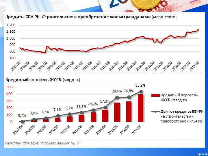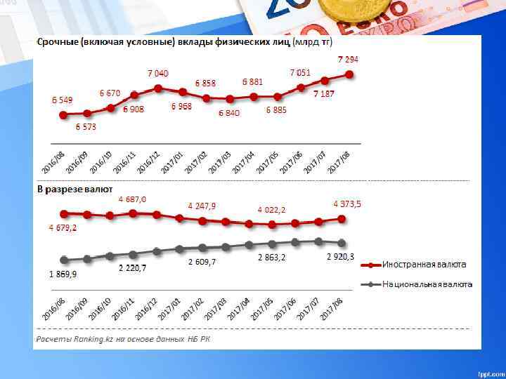• В то же время следует отметить, что казахстанцы не всегда доверяют нацвалюте. Так, сезонный* отток депозитов пришелся на нацвалюту (объем вкладов сократился на 2, 9% за месяц, до 2, 9 трлн тг), хотя вклады в инвалюте выросли к июлю на 4, 6% (до 4, 4 трлн в тенговом эквиваленте). • Девальвационные ожидания мешают жителям РК эффективно копить и преумножать средства. По данным Нацбанка в августе ставки по депозитам в тенге составляли в среднем 12, 2%, тогда как в валюте всего 2, 1%. С учетом укрепления нацвалюты (например, в среднем за сентябрь доллар стоил 339, 2 тг, но на 18 октября курс составлял уже всего 333, 5 тг), валютные накопления не самый эффективный вариант инвестиций. • *Сезонный отток средств с депозитных счетов населения в августе отмечается из года в год. Так, в августе 2016 спад объема вкладов в нацвалюте составлял 0, 9%, в 2015 2%, в 2014 сразу 6, 5%. Это связано в том числе со сборами к учебе, с необходимостью оплачивать начинающийся в сентябре учебный год, и т. д.