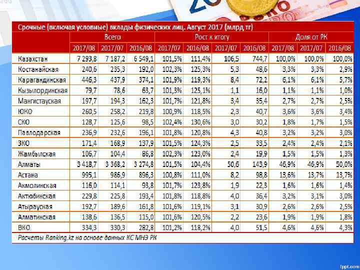 Срочные вклады физических лиц. Август 2017 Казахстанцы уверенно наращивают депозитную базу - объем банковских вкладов достиг по итогам августа 2017 уже 8 триллионов тенге, это на 1, 2% больше, чем в июле, и сразу на 12, 3% больше, чем годом ранее. Срочные и условные вклады населения (долгосрочные депозиты) также в фазе роста: уже 7, 3 триллиона тенге, +1, 5% за месяц, и сразу +11, 4% за год.