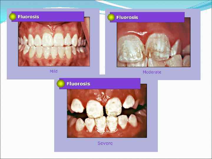 Недостаточное поступление фторида приводит, как правило, к развитию кариеса зубов, избыточное – к развитию флюороза Стоматологическое обследование детей, проживающих в регионе с низким содержанием фторида в питьевой воде, показали, что у большинства из них развивается кариес, однако у 11% 12 -летних был выявлен флюороз