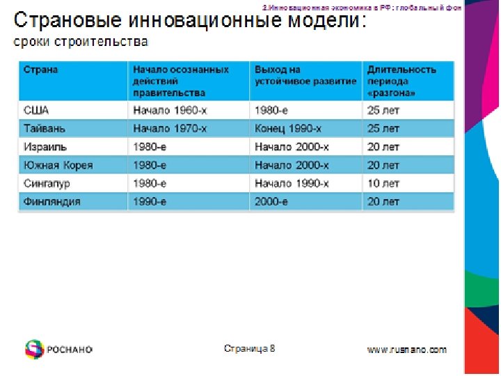 Общие черты инновационной политики развитых стран Государственной финансирование R&D, отвечающее национальным интересам Проведение в университетах и государственных исследовательских центрах исследований общенационального значения Воздействие на научно-исследовательскую и инновационную деятельность бизнеса посредством развитой контрактной системы Проведение соответствующей налоговой и амортизационной политики Организация и развитие системы распространения научнотехнической информации, включая специализированные сети Организация системы трансфера технологий