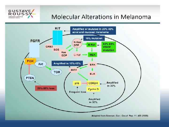 BRAF - мутация • Около 50 % всех меланом кожи имеют мутацию BRAF • Определение мутации BRAF имеет клиническое значение • BRAF ингибиторы вемурафениб, дабрафениб используются для лечения метастатической меланомой при мутации BRAF V 600 E