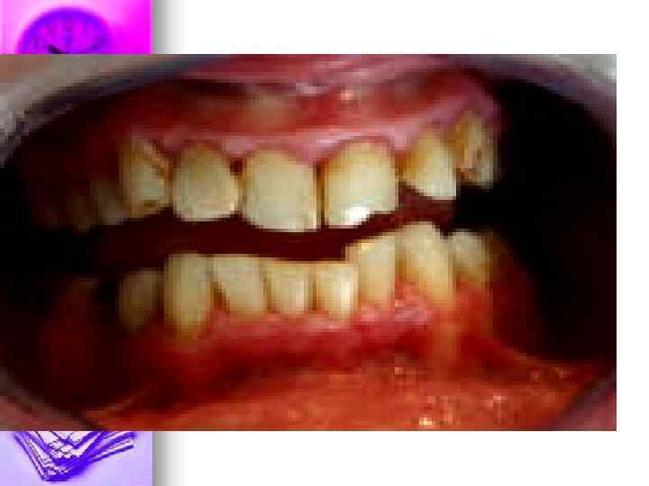 n n Anamnesis vitae: Больная 1, 5 года работает на кондитерской фабрике. Status localis: При внешнем осмотре изменений конфигурации лица не отмечается. Красная кайма губ и углы рта без изменений, обычной окраски. Слизистая оболочка щек бледнорозовая, увлажненная. Прикус ортогнатический. Слизистая оболочка десны бледно-розовая, плотно охватывает шейку зубов. Язык обычных размеров и окраски.
