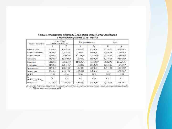 Методика. В работе использовали здоровыхполовозрелых кроликов-самцов породы шиншилла с исходной массой тела 2, 5 -3 кг. Животные были разделены на 3 группы по 7 животных каждой: группа 1 (К) — контрольная (интактные животные), группы 2 (Хс) и 3 — животные жедневно с пищей получали холестерин (0, 3 г на 1 кг массы тела) в течение 2, 5 месяцев. В качестве объектов исследования были выбраны афферентная и эфферентная лимфа брыжеечного лимфатического узла, брыжеечный исредостенный лимфатические узлы, централья лимфа и кровь.