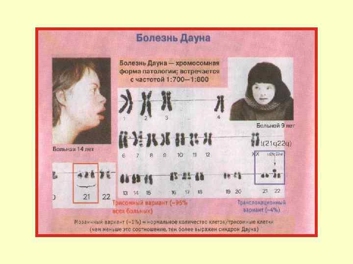 Хромосомные болезни • Являются особым видом наследственной патологии, связанной с повреждением их структуры (хромосомными мутациями) или нарушением их количества (геномные мутации). • ! !Структурные аномалии хромосом встречаются реже и обычно приводят к более тяжелым (большинство смертельны), по сравнению с количественными изменениями хромосом, последствиям. • Мутации в гаметах приводят к развитию полных форм хромосомных болезней, когда изменения кариотипа выявляются во всех клетках организма. • Мутации в соматических клетках на ранних этапах эмбриогенеза приводят к развитию мозаицизма: часть клеток организма имеет нормальный кариотип, а другая часть — аномальный.