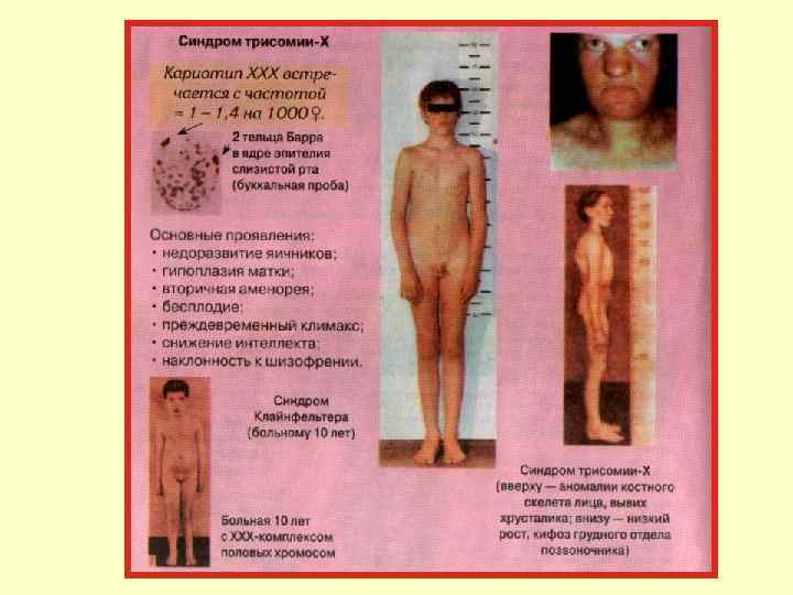 Аномалии, связанные с половыми хромосомами: Синдром Кляйнфельтера • Встречается у мужчин. Частота 2 на 1000 новорожденных мальчиков. Кариотип чаще: XXY, общее количество хромосом — 47. У больных мужчин содержится тельце Бара (половой хроматин). Аутосомы с 1 -й по 22 -ю пару без отклонений от нормы. До полового созревания развитие мальчиков мало чем отличается. • Для больных характерен высокий рост, астеническое телосложение, длинные ноги, широкий таз, гинекомастия, слабое оволосение на теле, азооспермия (отсутствие сперматозоидов), умственная отсталость. Описаны и другие цитогенетические варианты: ХХYY (клинически: глубокая дебильность и страшный садизм), 48 ХХХУ, 49 ХХХХУ и др.