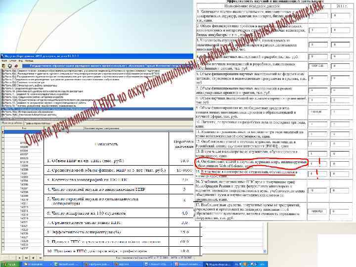 Целевые показатели эффективности деятельности ГБОУ ВПО, находящихся в ведении МЗ России: ПРИКАЗ МЗ РФ от 11 июня 2013 г. N 451 н 1. Выполнение утвержденного плана НИР (госзадания) – не менее 90%. 2. Количество проведенных научных, научно-практических и учебнометодических мероприятий (не менее 5 мероприятий в 1, 3 и 4 кварталах и не менее 2 мероприятий в 3 квартале). 3. Количество статей, опубликованных в журналах с импакт-фактором РИНЦ не ниже 0, 300. 4. Объем НИОКР в расчете на 1 научного работника не менее – 33, 76 тыс. руб.