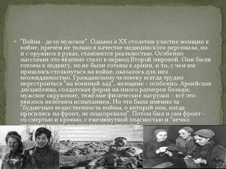 "Война - дело мужское". Однако в ХХ столетии участие женщин в войне, причём не только в качестве медицинского персонала, но и с оружием в руках, становится реальностью. Особенно массовым это явление стало в период Второй мировой. Они были готовы к подвигу, но не были готовы к армии, и то, с чем им пришлось столкнуться на войне, оказалось для них неожиданностью. Гражданскому человеку всегда трудно перестроиться "на военный лад", женщине – особенно. Армейская дисциплина, солдатская форма на много размеров больше, мужское окружение, тяжёлые физические нагрузки – всё это явилось нелёгким испытанием. Но это была именно та "будничная вещественность войны, о которой они, когда просились на фронт, не подозревали". Потом был и сам фронт – со смертью и кровью, с ежеминутной опасностью и "вечно преследующим, но скрываемым страхом".