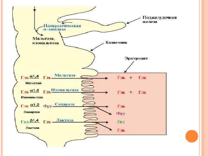 Ферменты тонкого кишечника, гидролизующие дисахариды, образуют фементативные комплексы, локализованные на поверхности энтероцитов (пристеночное пищеварение): сахаразо-изомальтазный (включает сахаразу, мальтазу и изомальтазу), гликоамилазный (включает ферменты, расщепляющие олигосахариды и мальтозу), β-гликозидазный (проявляет активность лактазы)