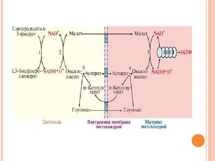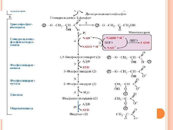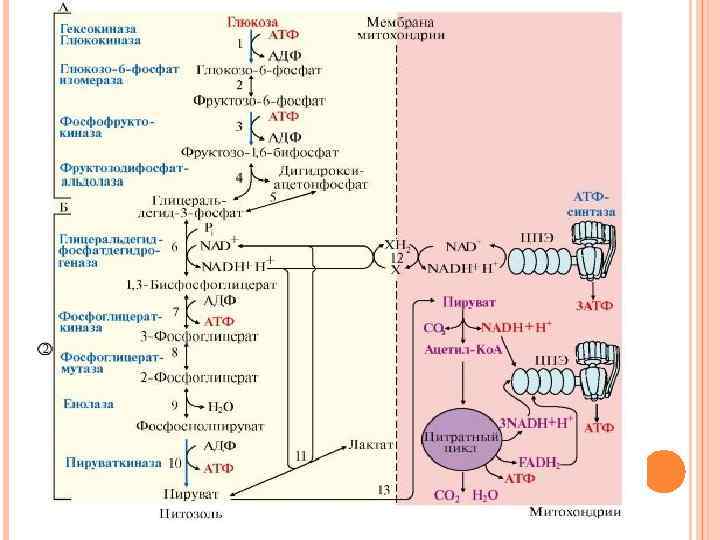 ОБРАЗОВАНИЕ АТФ ПРИ АЭРОБНОМ ГЛИКОЛИЗЕ МОЖЕТ ИДТИ ДВУМЯ ПУТЯМИ: путем субстратного фосфорилирования, когда для синтеза АТФ из АДФ и Н 3 РО 4 используется энергия макроэргической связи субстрата (реакции 6, 10) путем окислительного фосфорилирования за счет энергии переноса электронов и протонов по ЦПЭ (реакции 6, 12).
