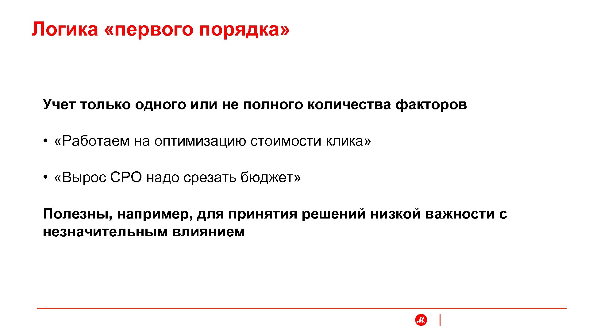 Логика «первого порядка» Учет только одного или не полного количества факторов • «Работаем на оптимизацию стоимости клика» • «Вырос CPO надо срезать бюджет» Полезны, например, для принятия решений низкой важности с незначительным влиянием