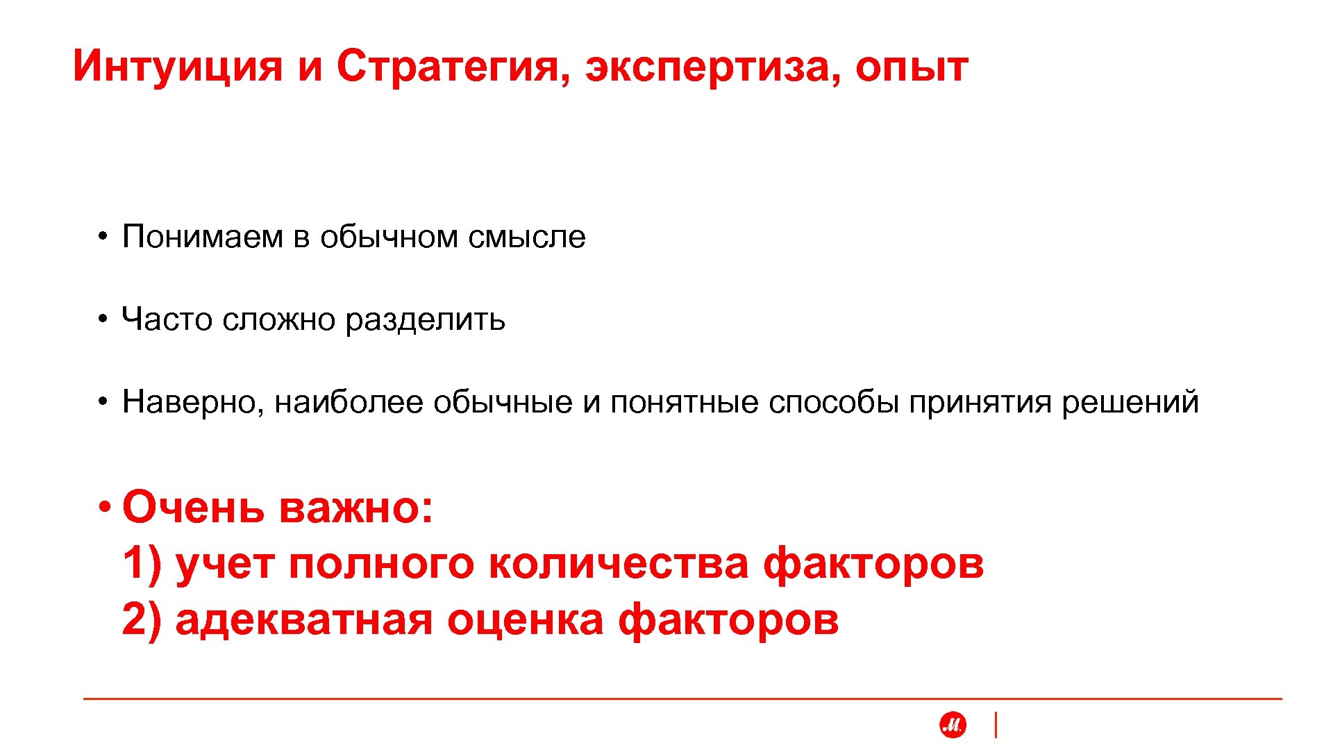 Интуиция и Стратегия, экспертиза, опыт • Понимаем в обычном смысле • Часто сложно разделить • Наверно, наиболее обычные и понятные способы принятия решений • Очень важно: 1) учет полного количества факторов 2) адекватная оценка факторов